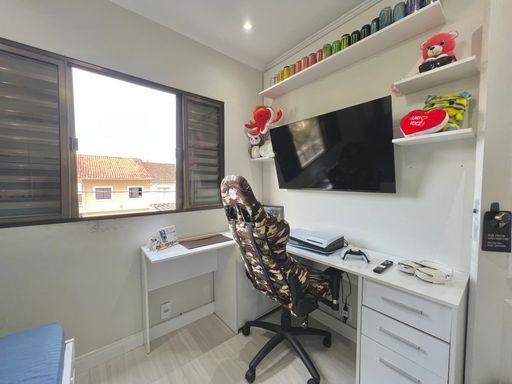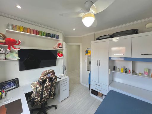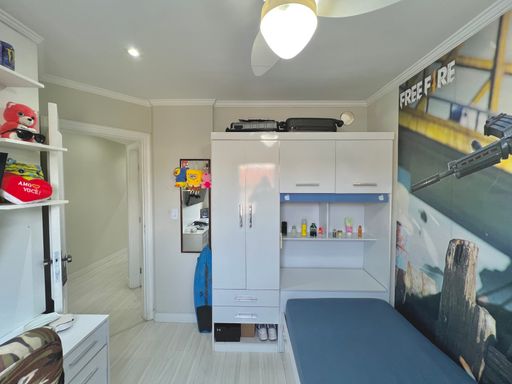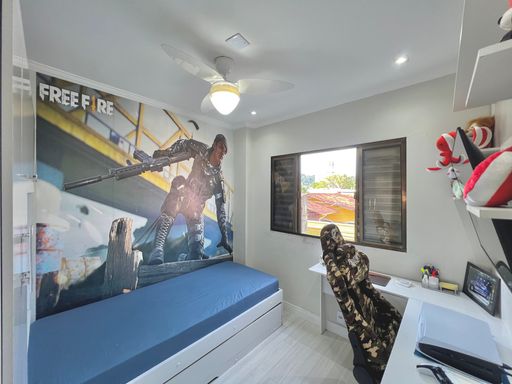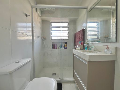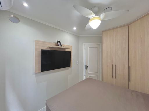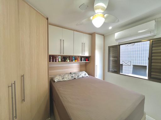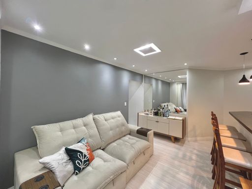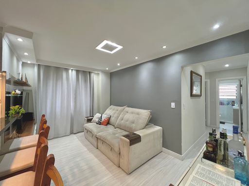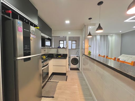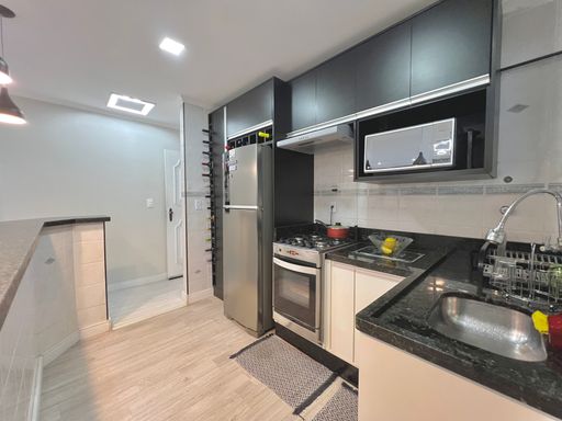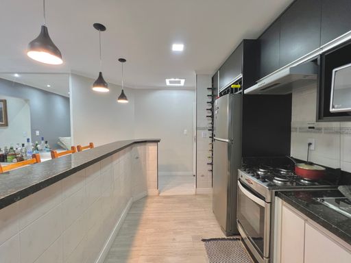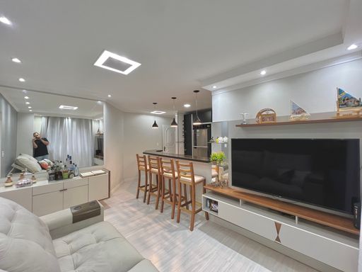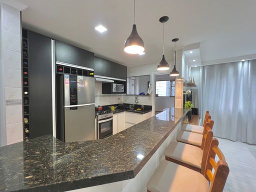 Com 84m² de área útil, o apartamento conta com uma sala ampla, banheiro social, cozinha estilo americana, área de serviço e 02 dormitórios. Além de 01 vaga de garagem.